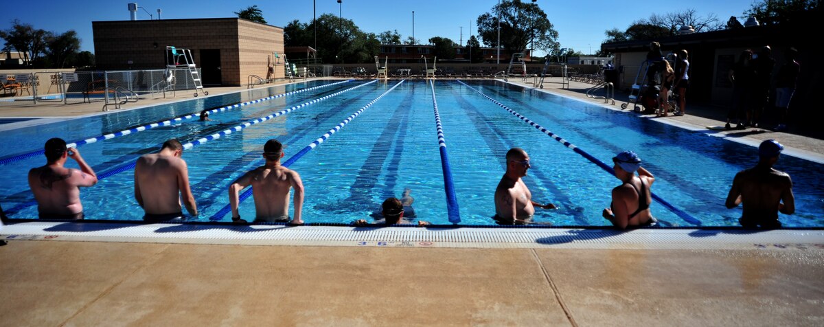 Competitors for the mini triathlon line up in preparation at the DZ Pool at Cannon Air Force Base, N.M., Aug. 25, 2012. This fitness challenge included a 500-meter lap swim, 8.5-mile bike ride and a 3.2-mile run. (U.S. Air Force photo/Senior Airman Whitney Tucker)