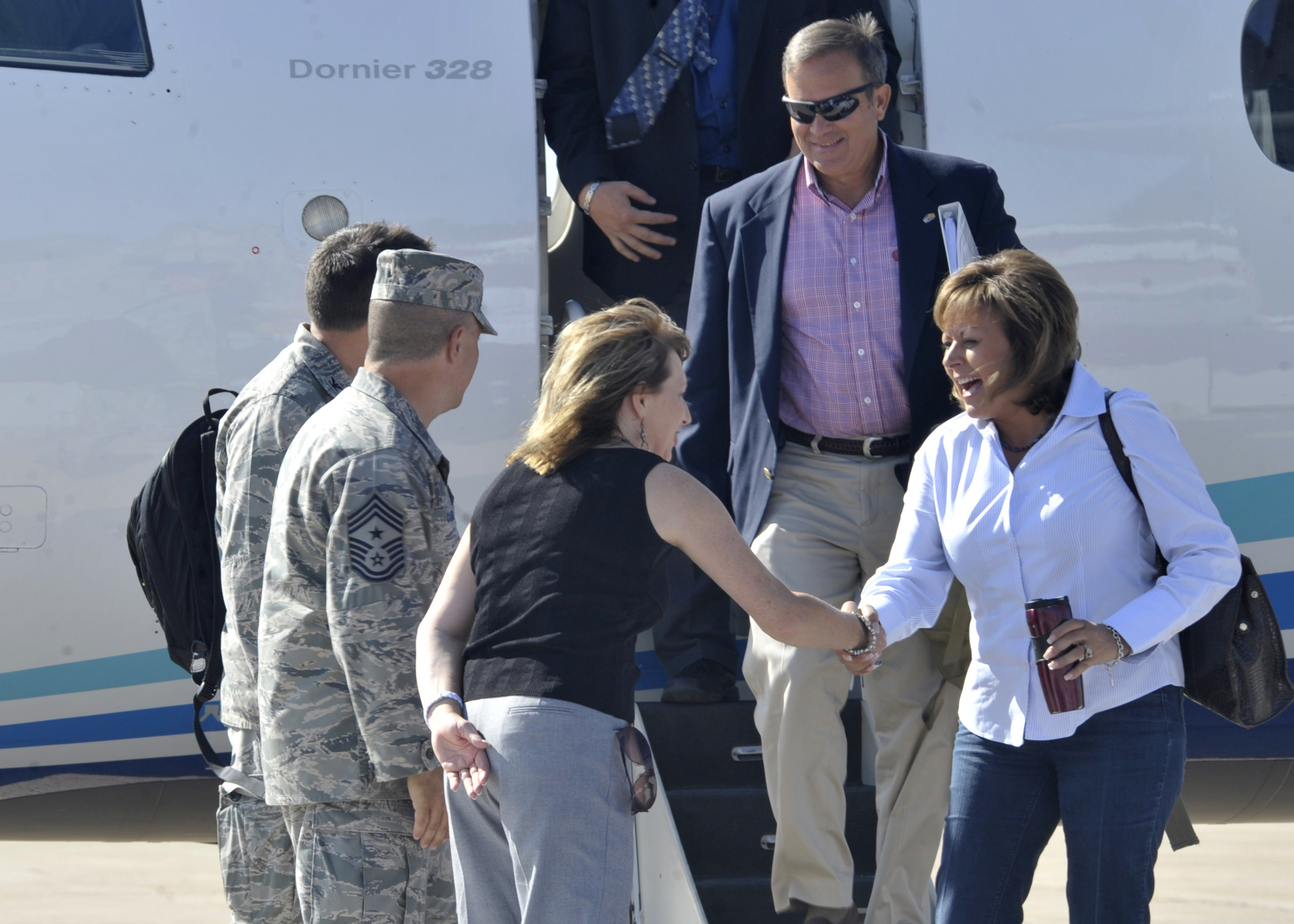U.S. Air Force Chief Master Sgt. Matthew Caruso, 27th Special Operations Wing command chief and Sheila Glover, 27th Special Operations Wing chief of protocol, welcome New Mexico Gov. Susana Martinez to Cannon Air Force Base, July 27, 2011, for a base tour. The trip was the governor's first official visit to a New Mexico Air Force Base since taking office in January 2011. (U.S. Air Force photo by Airman Ericka Engblom)
