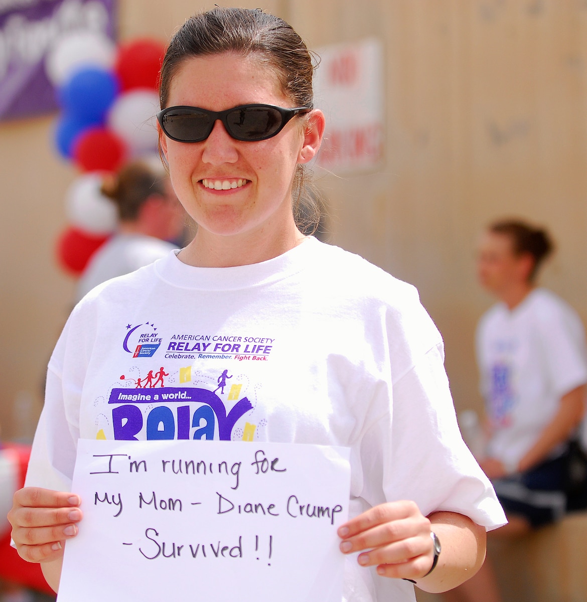 KIRKUK REGIONAL AIR BASE, Iraq -- Staff Sgt. Ashley Jamison, 321st Expeditionary Logistics Readiness Squadron, deployed from the 27th Special Operations Logistics Readiness Squadron's vehicle maintenance section at Cannon Air Force Base, shows support for her mother during a Relay for Life 5K run/walk April 2. Nearly 200 people - including U.S. Air Force, Army and contractors - participated in the event along with Iraqi supporters to raise money for the American Cancer Society. (U.S. Air Force courtesy photo)