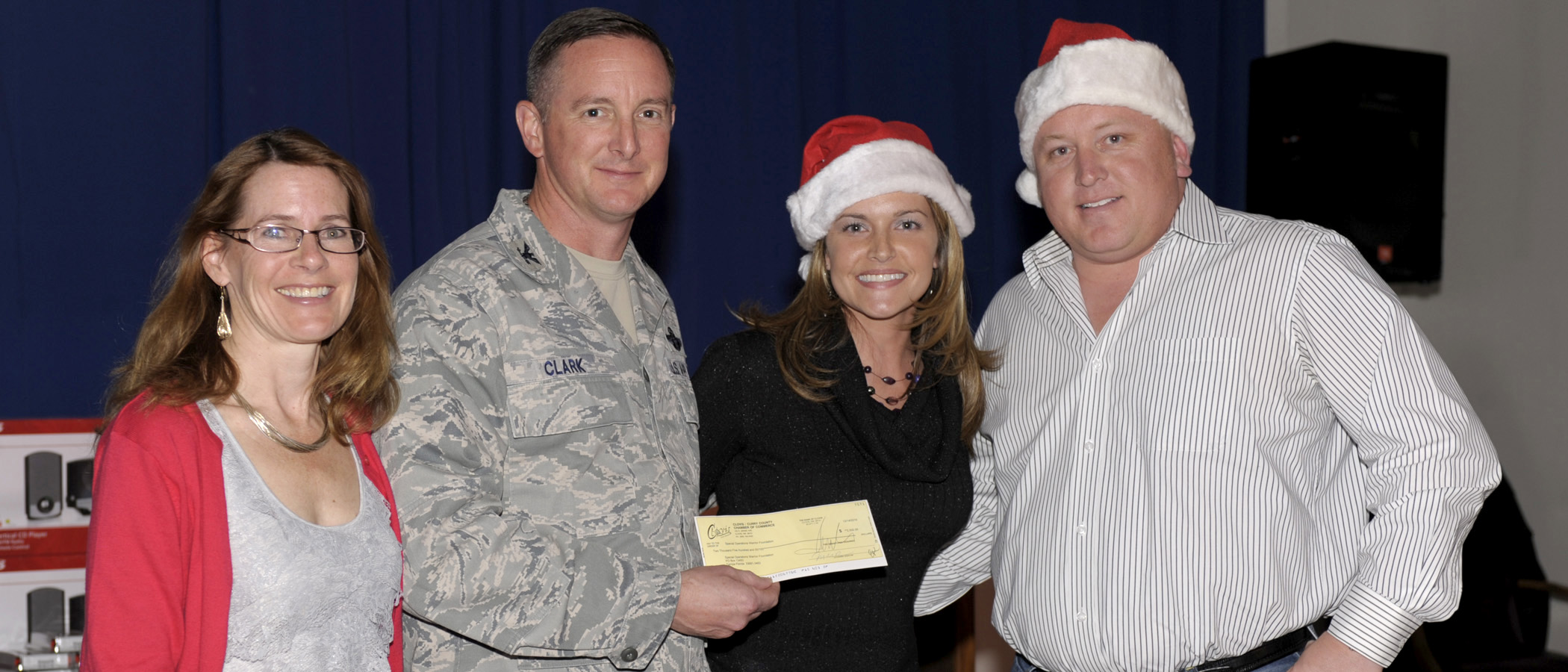 U.S. Air Force Col. Stephen Clark, commander, 27th Special Operations Wing, presents a check to Sarah Stagner during the Single Airmen's Dinner at the Drop Zone Dec. 14. Stagner is a volunteer, who along with her husband Justin organized the entire Single Airmans Dinner. (U.S. Air Force Photo by