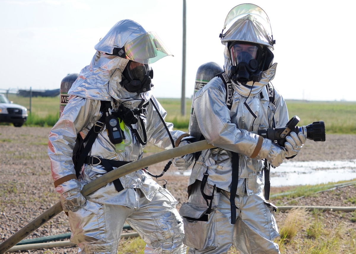 Cannon firefighters Airmen 1st Class Erik Galvez (left) and Gabriel Mannix provide a safety backup for firefighters from the Clovis, N.M., Fire Department, July 26, 2010. The city firefighters, who focus on structural blazes, came to the base to meet Federal Aviation Agency standards for aircraft fire training. (U.S. Air Force photo by Greg Allen) (RELEASED)