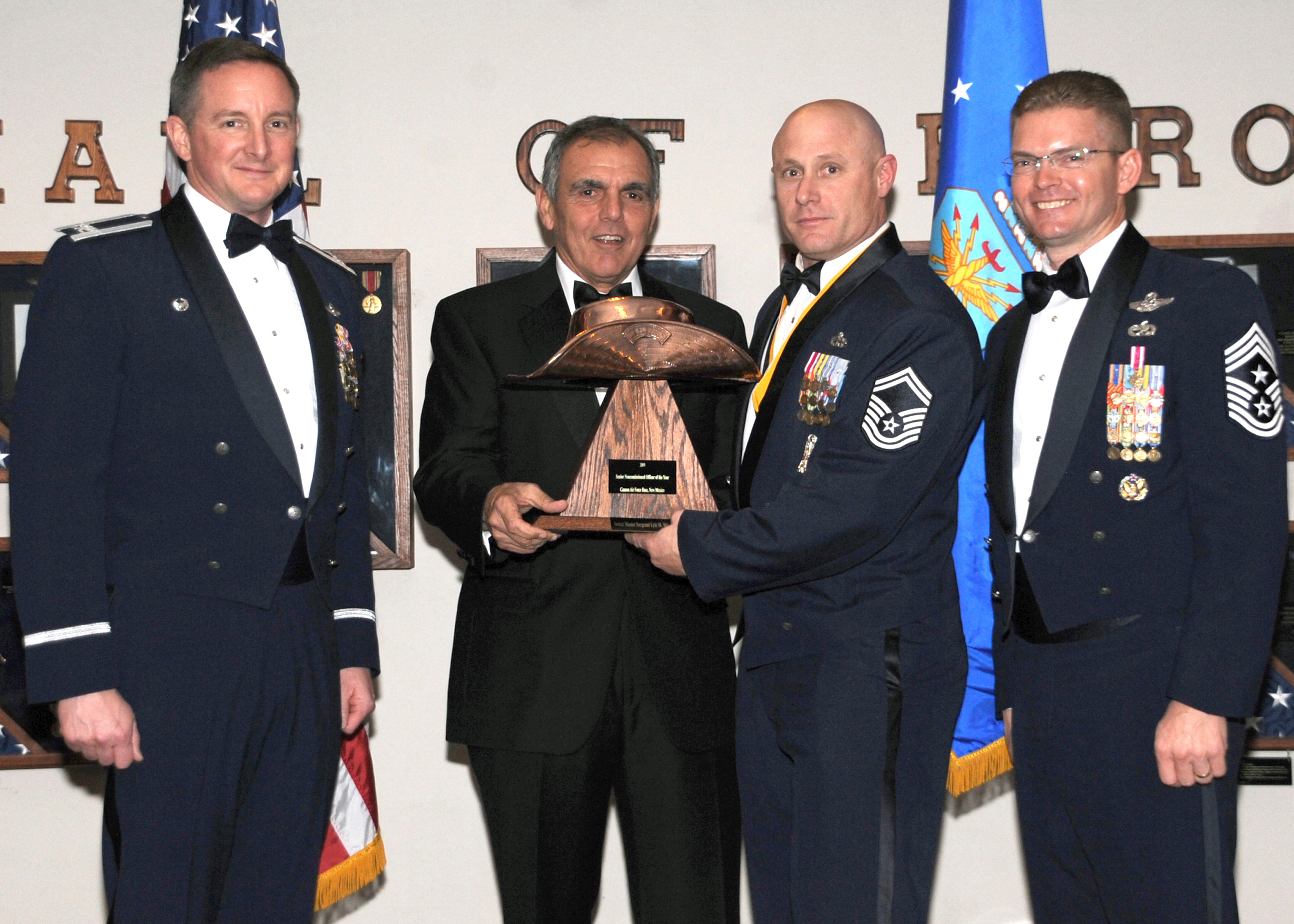 Senior Master Sgt Lyle M. Winnicki, 27th Special Operations Maintenance Group, receives the Senior Non-Commissioned Officer of the Year award from (left) Col. Stephen Clark, 27th Special Operations Wing commander, retired Air Force Maj. Gen. Richard Comer, and (right) Chief Master Sgt. William Turner, wing command chief. The wing's top Airmen and civilians were recognized at the annual awards dinner at The Landing Zone at Cannon Air Force Base, N.M., Feb. 20. (U.S. Air Force photo by Airman 1st Class Maynelinne De La Cruz)