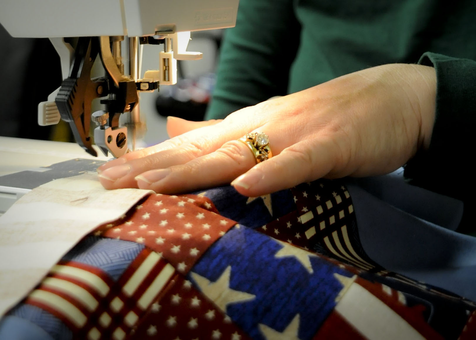 Amy Armenta sews a pattern for a quilt at the Airman and Family Readiness Center at Cannon Air Force Base, N.M., Feb. 19. She is a member of Operation Homefront Quilts, an organizaton that makes and sends quilts to families of fallen servicemembers. Since April 2004, Cannon volunteers have made nearly 600 quilts. (U.S. Air Force photo/ Senior Airman Erik Cardenas)