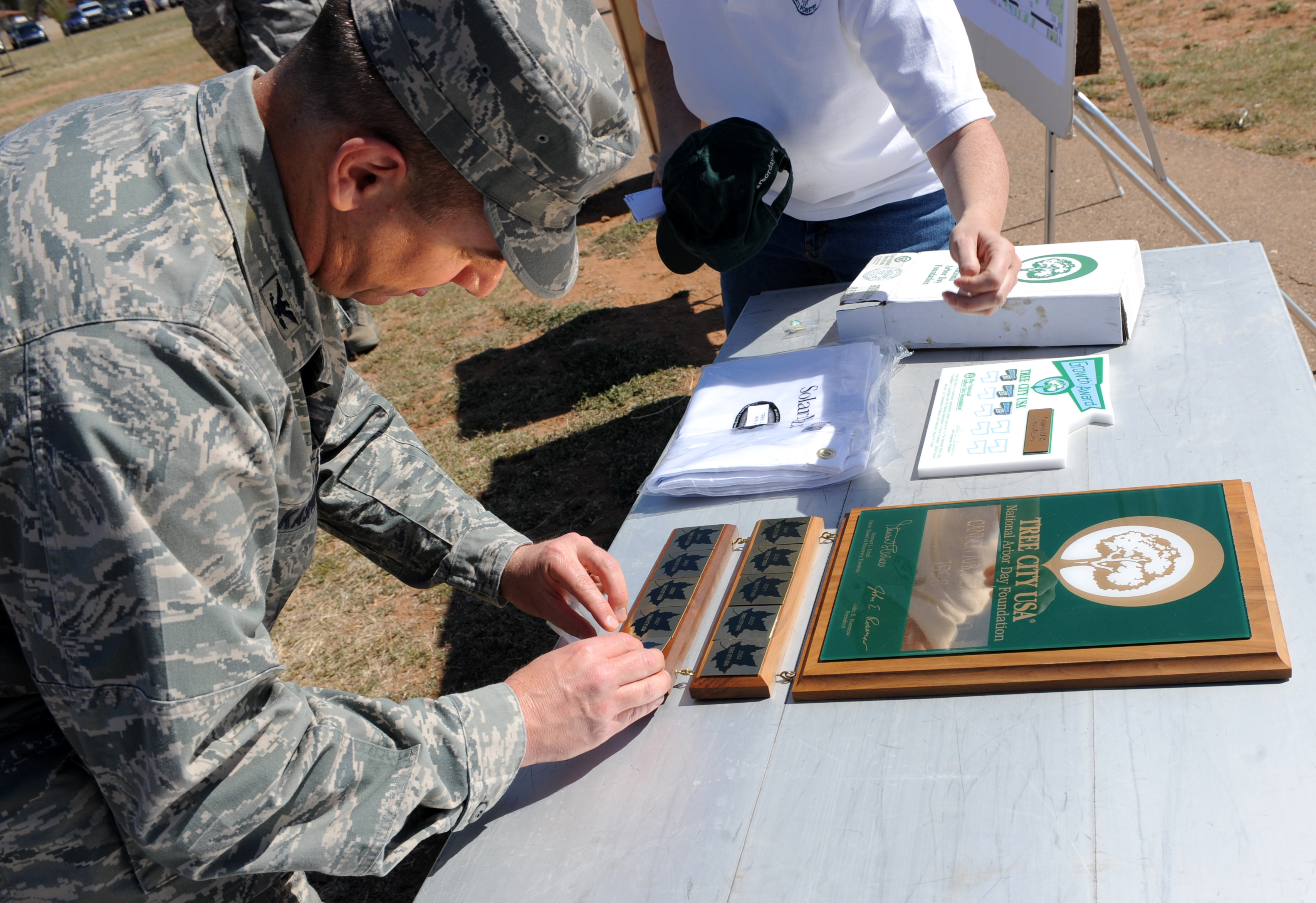 CANNON AIR FORCE BASE, N.M. -- Shannon Atencio, Las Vegas District Forestry Department, and Col. Ruedi Kaspar, 27th Special Operations Wing vice commander, plant a tree at Doc Stewart Park here April 22. The Arbor Day Foundation named Cannon as a 2009 Tree City USA community and presented Cannon with its first Growth Award. The 27th Special Operations Civil Engineer Squadron Natural Resources Management Flight hosted numerous Arbor Day events from April 16-23. (U.S. Air Force Photo/Airman 1st Class Evelyn Chavez)