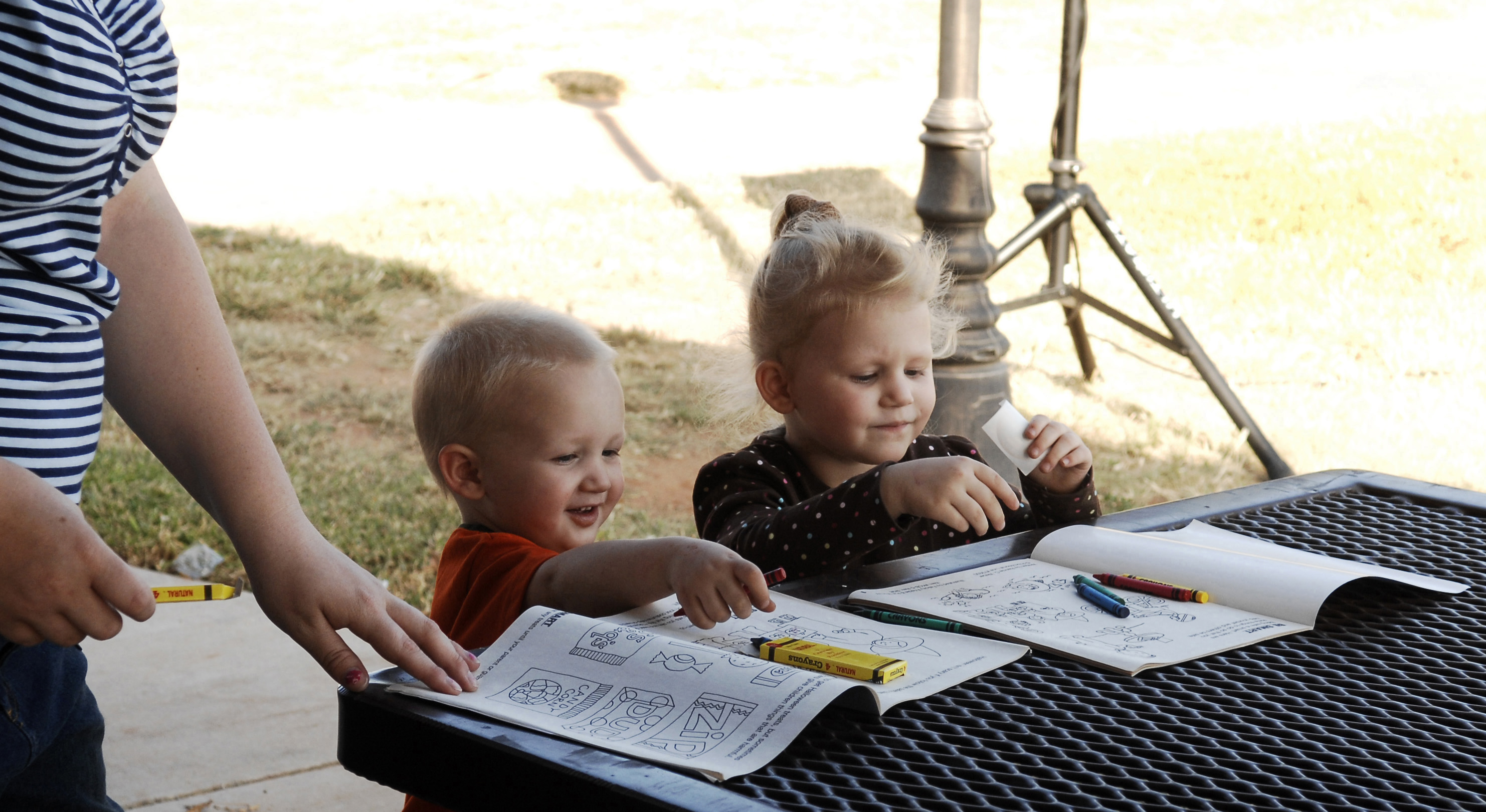 CANNON AIR FORCE BASE, N.M. - Zachary and Madison Schwab, children of Staff Sgt. Bobby Schwab, 27th Special Operations Equipment Maintenance Squadron, color during Cannon's kickoff of National Crime Prevention Month Oct 2.Coloring books, pens, pencils, and other gadgets were passed out to children who participated in the events. (U.S. Air Force photo/Airman 1st Class Danielle Martin)