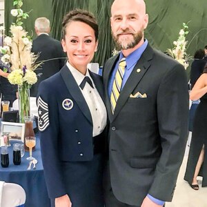 Members of the 27th Special Operations Security Forces Squadron pose for a photo after volunteering at the National Night Out in Clovis, N.M., August 6, 2019. The members hosted events such as a dunk tank, face painting, a military working dog demonstration and instructional course on the dangers of